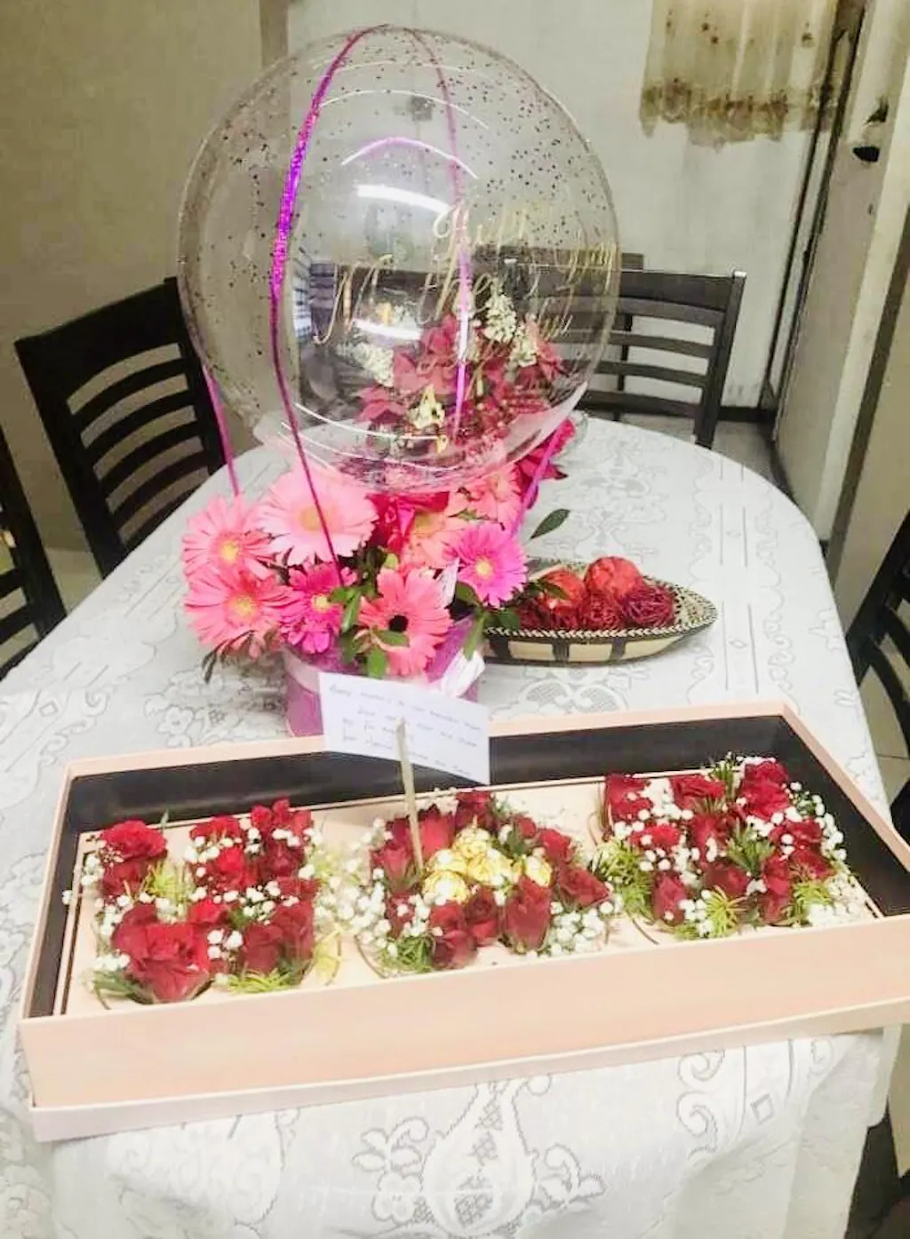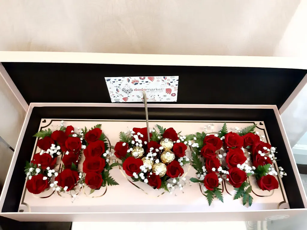 Mother's Day Special composition in a gift box. Lovely M❤️M symbols decorated with roses, chocolates, gypsophila, and leaves. For every mom to love :)