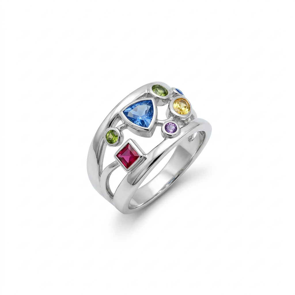 Make a dazzling statement with this extraordinary 925 Sterling Silver cocktail ring. Featuring multiple bands adorned with an array of colourful cubic zirconia stones — from rich pink and regal purple to deep emerald green and warm champagne — this ring is a true celebration of colour and light.