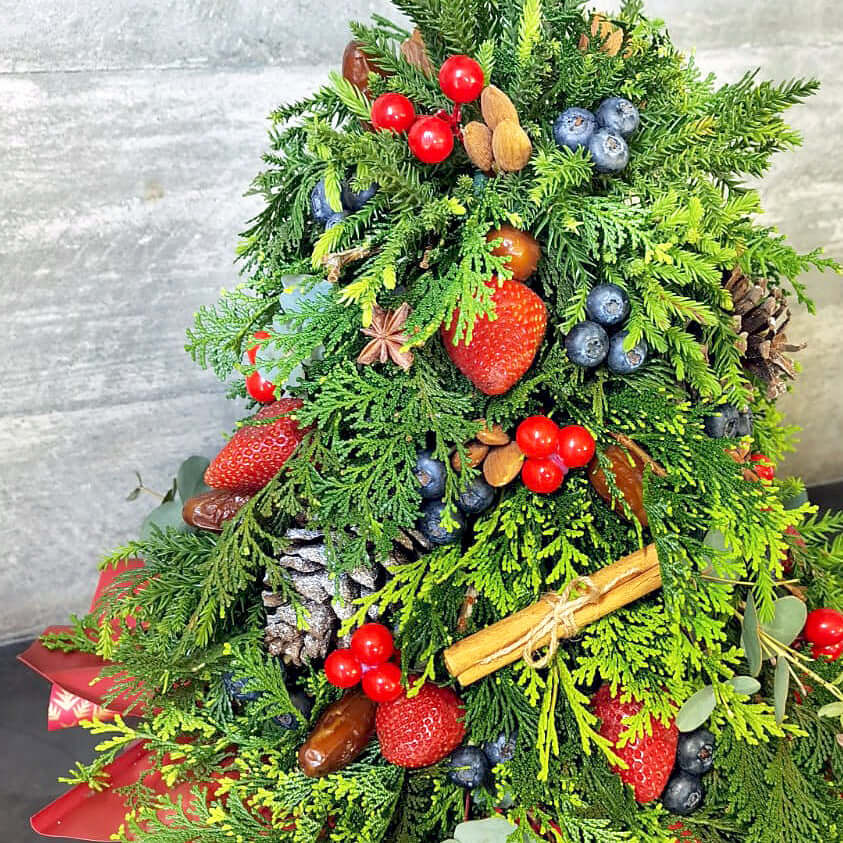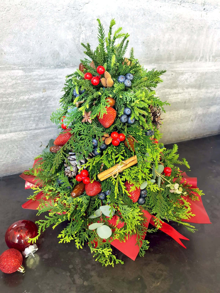 This mini Christmas tree is a charming floral arrangement crafted with natural greenery, festive berries, and Xmas decorations. Bring the spirit of the holidays into your home with this adorable and elegant piece. Perfect as a centerpiece or to add a touch of holiday cheer to any room.