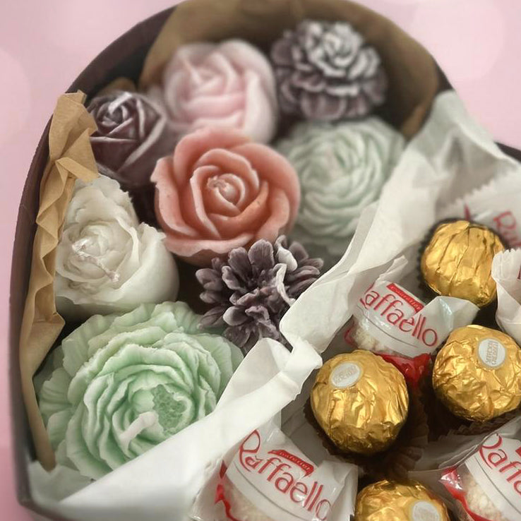 This luxurious gift set features a stunning arrangement of floral candles paired with a delightful mix of Raffaello and Ferrero chocolates. A perfect way to express love and affection — for any occasion that deserves a touch of sweetness and beauty.