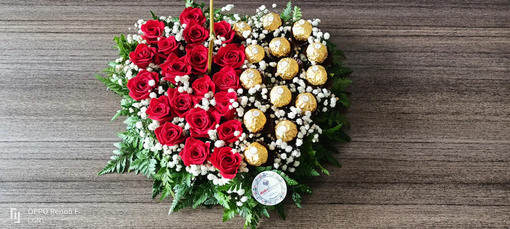 An astonishing heart-shaped arrangement of Red Roses and Ferrero Rocher chocolates for a loved one. The composition is lovingly arranged with seasonal greenery. Time to be romantic and send your love!