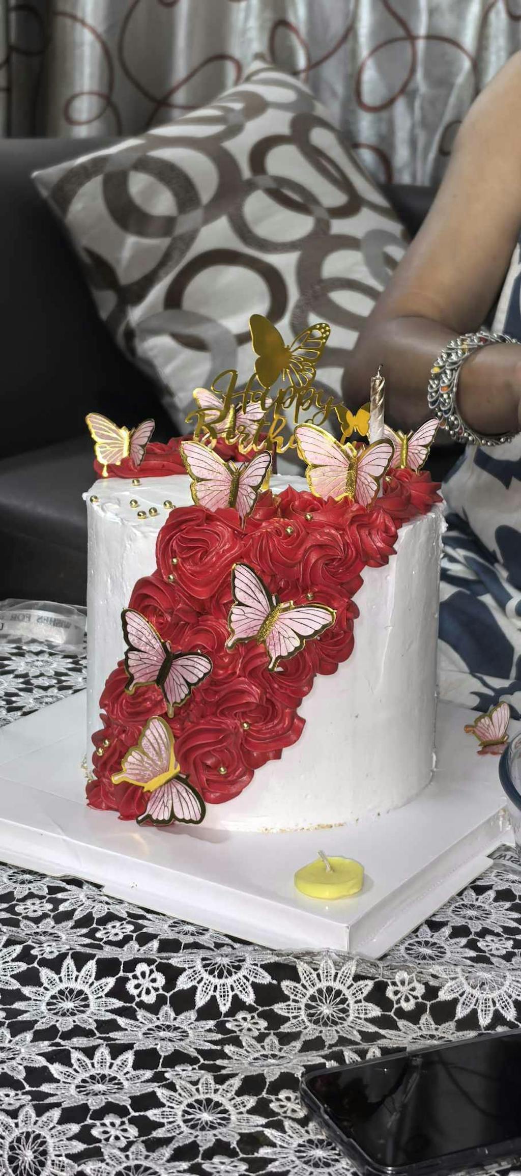 Magnifique gâteau d'anniversaire décoré de papillons et de roses à la crème. Impressionnante variété d'options de saveurs pour tous les goûts!