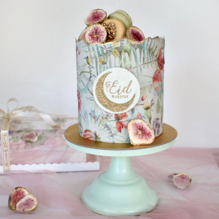 Magnifique et délicieux gâteau Eid Mubarak pour une célébration glorieuse! Trois tailles disponibles et trois délicieuses saveurs de votre choix, décorées d'un imprimé de fleurs comestibles, d'une décoration pour l'Aïd, de macarons et de fruits. Un incroyable cadeau Eid pour vos proches.