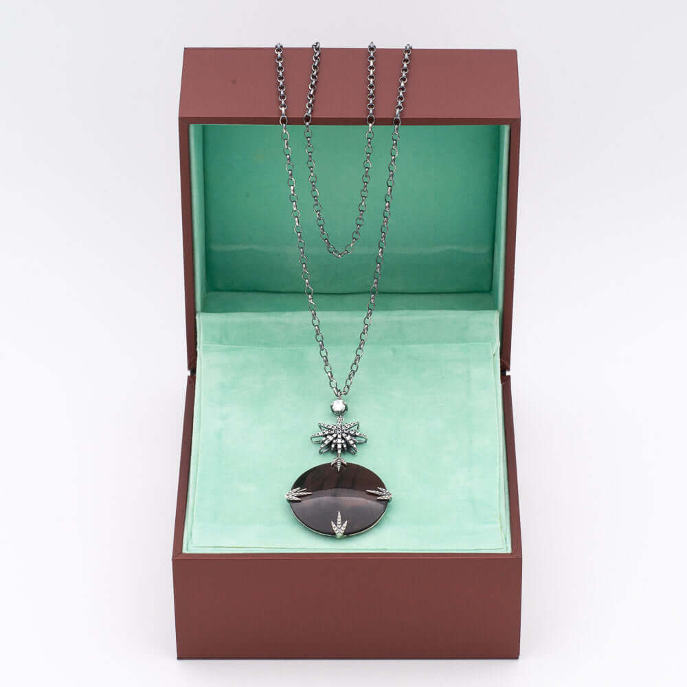 Un ensemble sophistiqué de colliers en argent se compose d'une longue chaîne et d'un pendentif en argent 925 avec zircone cubique et résine. Ce chef-d'œuvre en argent noirci double face peut devenir un cadeau exclusif pour quelqu'un de spécial.