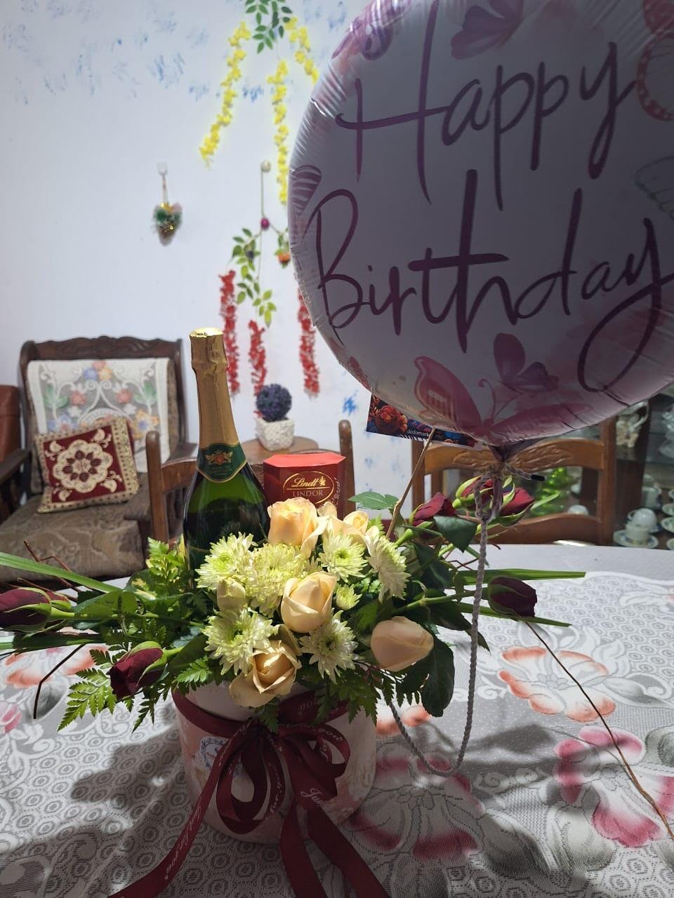 Awesome bouquet with the champagne and chocolate. Really appreciated