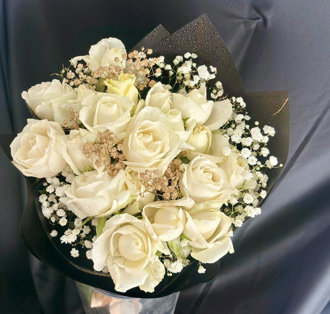 Roses blanches immaculées , chacune symbole de pureté, de grâce et de renouveau, sont artistiquement agencées avec une délicate touche de gypsophile, qui apporte une subtile brillance et une texture aérienne. Le bouquet est emballé à la main dans un luxueux papier noir orné d'un motif doré moderne et artistique.