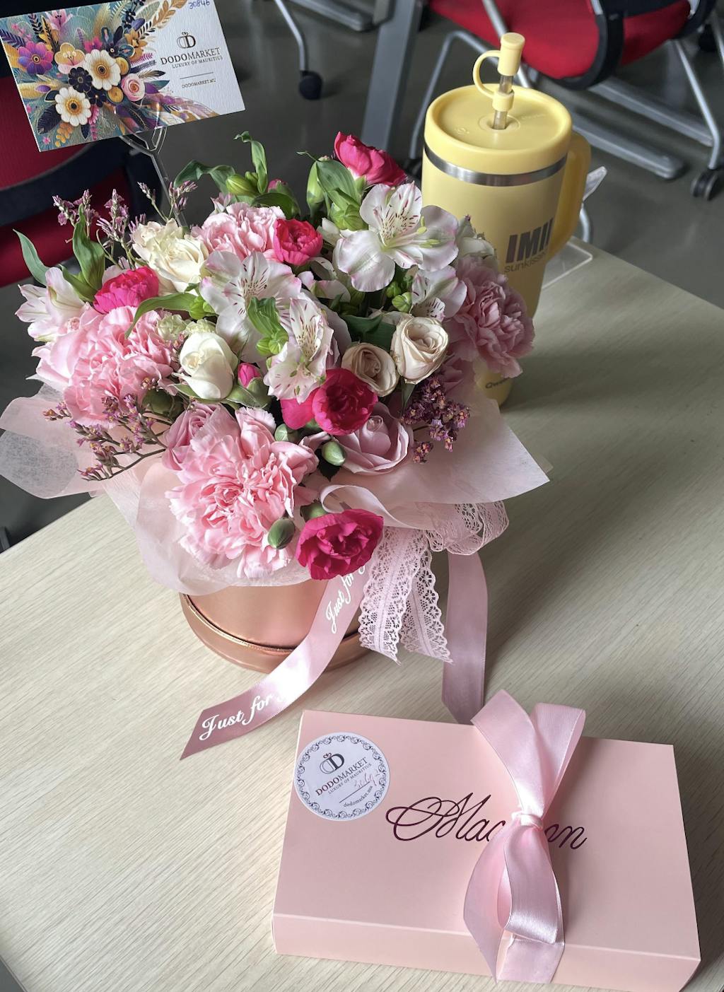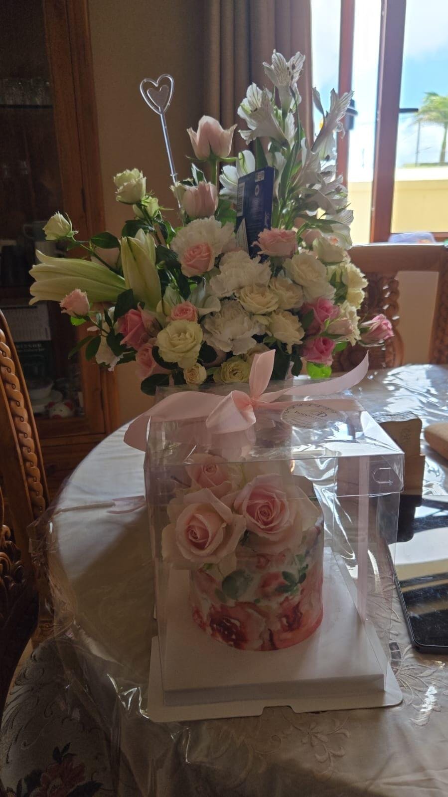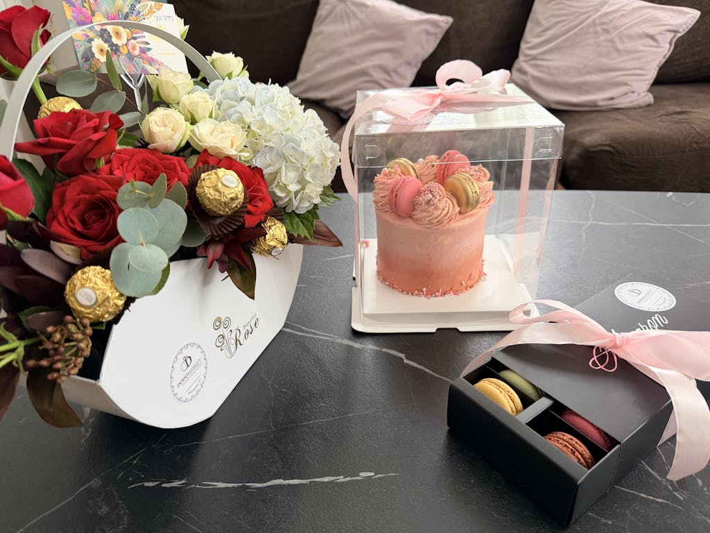 Thank you very much for your service. My husband loved the cake. The bouquet is beautiful and macarons yummy!