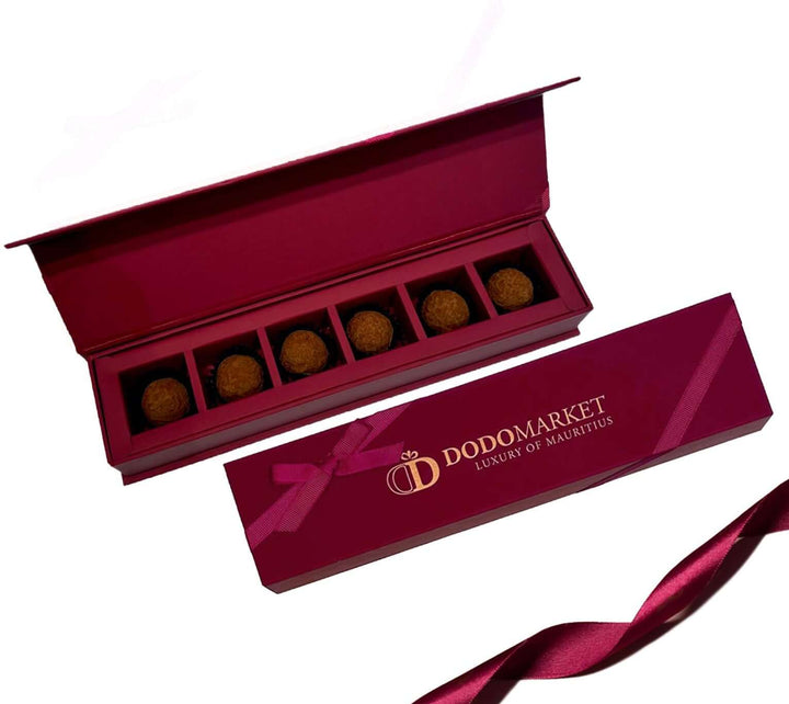 The gift box includes 6 Chocolate Truffles, flavor: Rum, alcohol-infused